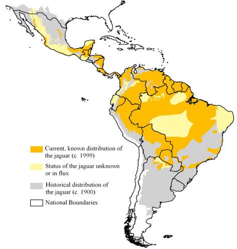 Though initially, they were abundant in Africa, Asia, and Europe, the modern distribution of jaguars in the wild mainly inhabits the American continents, which is almost 63% of the historic distribution. Their range ranges from the Southwestern United States, Mexico, through Central America into northern South America including various countries such as Argentina, Belize, Brazil, Colombia, etc. It says that they are extinct in Chile, El Salvador, Uruguay, etc. (Their distribution heavily revolves around Amazon Rain forests in South America). None of them can be seen in the wild in Asia/ Sri Lanka.