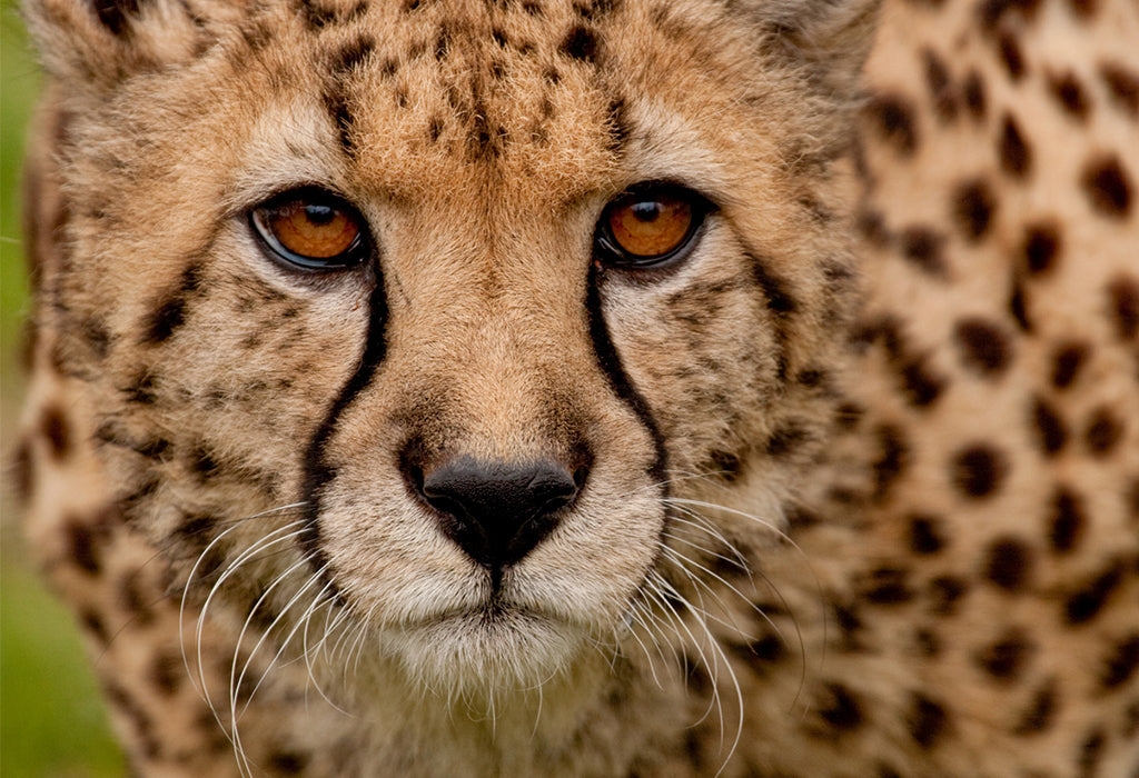 Cheetahs have small heads, small ears, and wide-set eyes. Rapid acceleration necessitates cheetah adaptations such as enlarged nostrils and extensive, air-filled sinuses. A cheetah’s specially adapted repertory system allows it to go from a normal rate of 60 to 150 breaths per minute while running. Less developed whiskers around the face indicate that cheetahs are not as active at night as other felids.