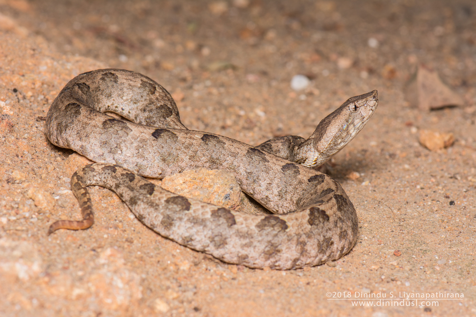 Endemic to Sri Lanka. Can grow up to 35 cm long. Triangular-shaped head. Across the eyes and cheeks, there’s a dark stripe. Venter is lighter than dorsum; which is yellow-brown or dark brown. Ridged costal scales.