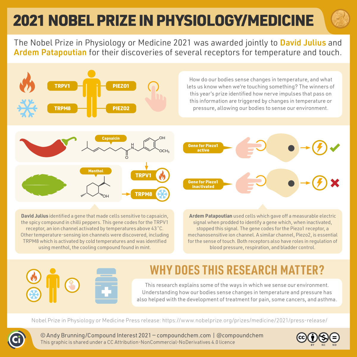 - The Nobel Prize in Physiology or Medicine 2021. (n.d.). Nobelprize.Org. Retrieved October 17, 2021, from https://www.nobelprize.org/prizes/medicine/2021/press-release/